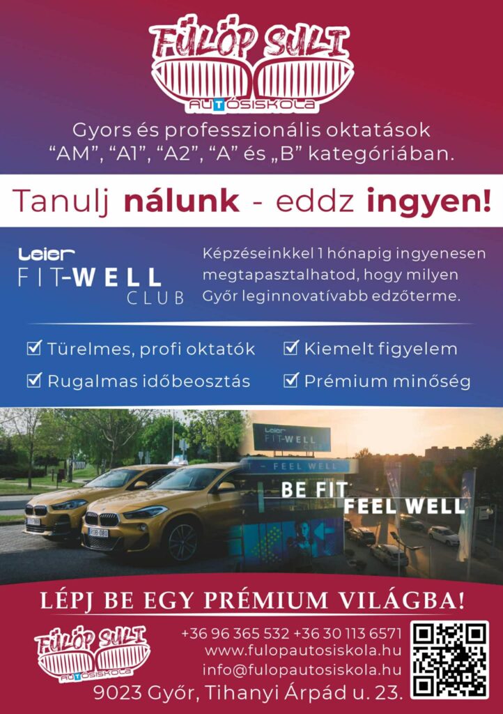 Folyamatosan bővülő, fiatalos, rugalmas oktatói csapattal biztosítjuk a gyors és színvonalas elméleti és gyakorlati oktatást. A képzés Győr- Moson-Sopron megye területén, elsődlegesen Győrben történik, “AM”, “A1”, “A2”, “A”, „B” kategóriában. Mindez kedvező áron, részletfizetési lehetőséggel.